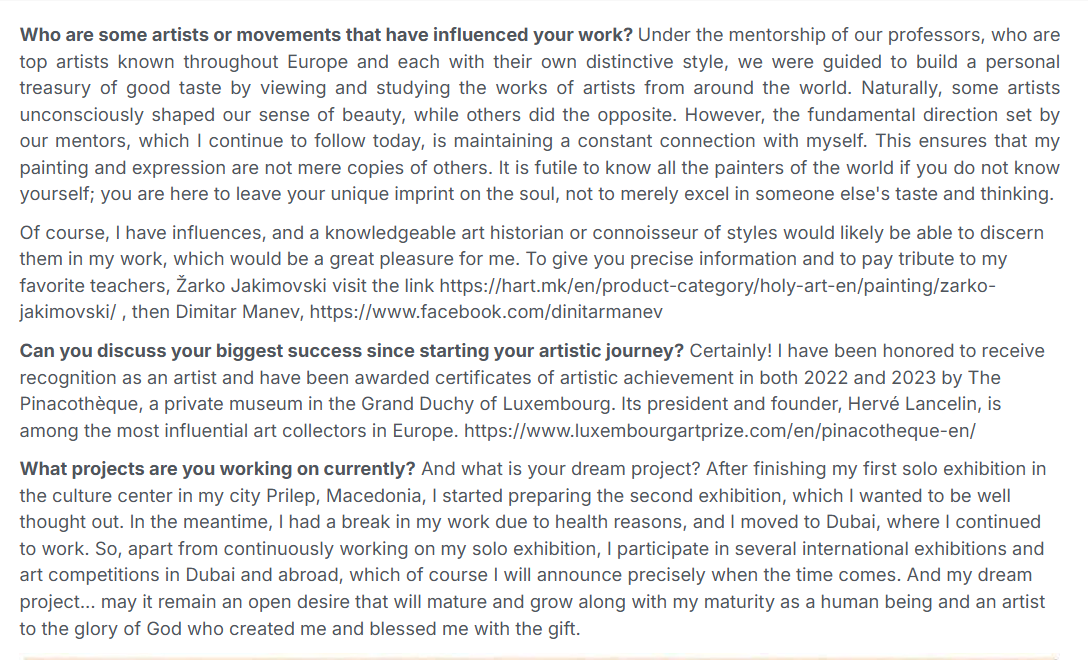 Over the previous years, I've actively taken part in numerous group exhibitions held in Prilep, Macedonia. These exhibitions were organized by the Society of Fine Artists https://www.markocepenkov.org/ , of which I was a member. Please take a moment to browse through a selection of the photos I've gathered from these events.