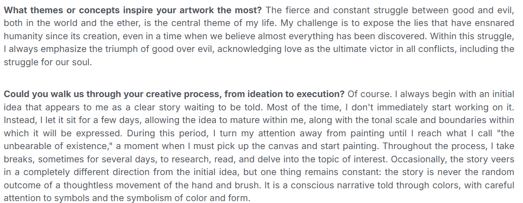 "Our team at Art Whisper Global had the great pleasure of selecting these artists – true masters with a unique approach and creative vision. Their stories and the talent they carry make their works genuine sources of inspiration and emotion, illuminating every page of this edition. This process reaffirmed our love for art and its power to touch everyone."