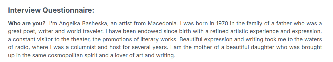 Upon the invitation of El Gramet from Argentina, I was honored to represent Macedonia in the grand project "Manifesto Universal", which brings together 200 artists from around the world. With great joy, I accepted the invitation and eagerly await the next phase of this beautifully envisioned project, which I believe will fulfill its noble mission: "The Reconstruction of a World in Harmony."