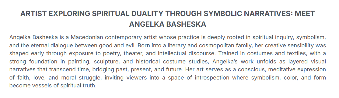 The search for an ideal transcendental essence and the love of contemplation brings man closer to the sublime spiritual riches. Thus, drinking from the source of God's grace, the soul of the believer becomes a spiritual beacon. On the way to divine perfection – faith, love and hope serve as a military stronghold and spiritual food. The work of the artist Angelka Basheska becomes a life-giving inspiration and a reminder of the power of faith and love, of the miraculousness of the human soul and its angelic ability to serve, help and manage.