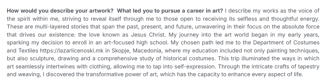 On October 26/ 2024, I was awarded as an artist for mixed media and tapestry, organized by the Luminaru Awards and Jesno Jackson, the founder of Galeria4you. My brightest moment on stage was when I saw MACEDONIA on the statuette. Macedonians are sorghum, if sorghum wants to "take hold", it will grow. Glory to God for every moment when I hear your name MACEDONIA. ❤️